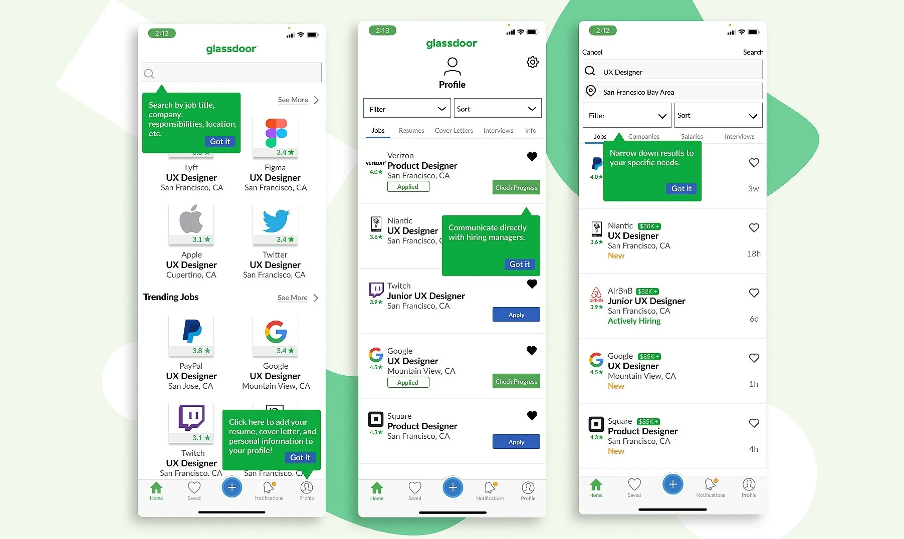Glassdoor is well known for their indepth reviews of other companies. They also allow users to search and apply for potential jobs. However, our data shows that a majority of users are unable to utilize job search features on the mobile app. We suspect that users are not able to interact with the mobile app intuitively.