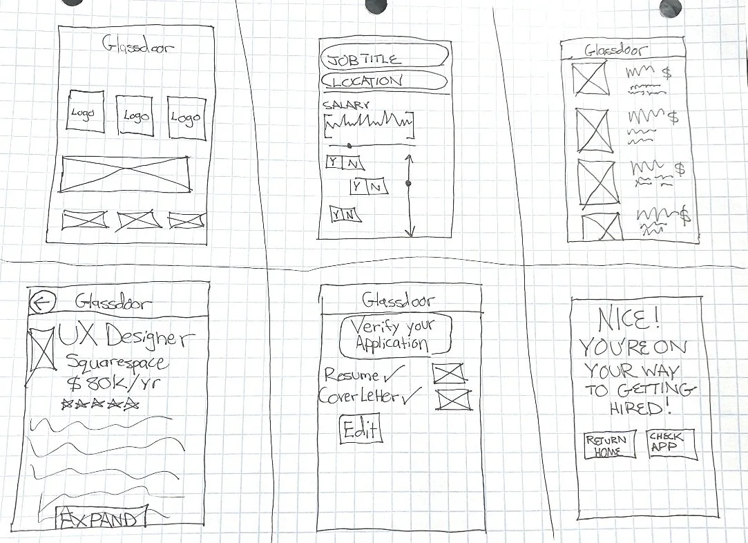 Once we applied our sketches to our mid-fidelity wireframes, we realized we needed to organize features to fit in with Glassdoor’s navigational organization. At this phase of our design process, I worked on the search and job screens. My intentions were to create a way to better digest information with a clean and simple format. To create a better way to track jobs, I added a “check progress” feature to encourage applicants to message potential employers.